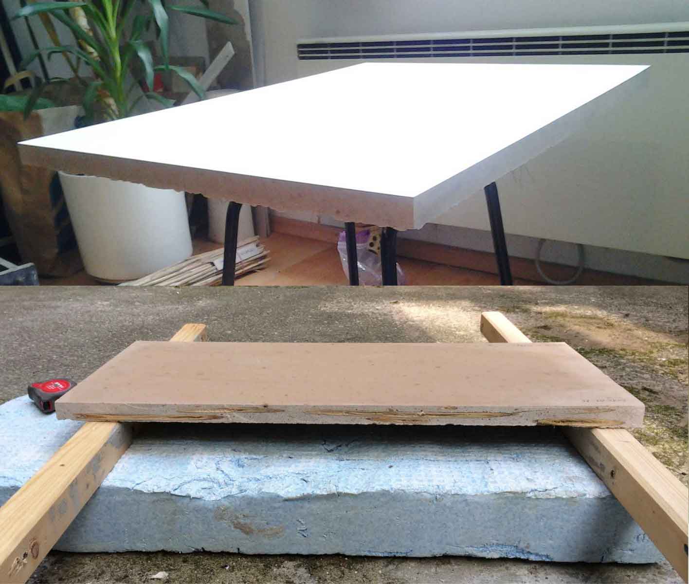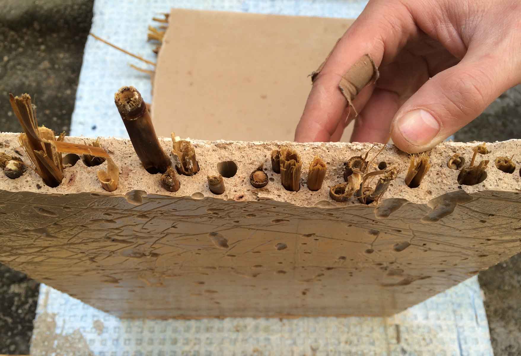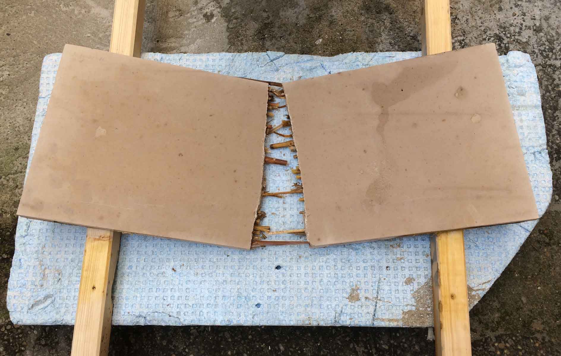 Riss bei 42kg, volles Versagen bei ca 100kg. Für statische Stabilität war entscheidend Schilf in der Zugzone. Komposits-Dichte ca 1100 kg/m3
